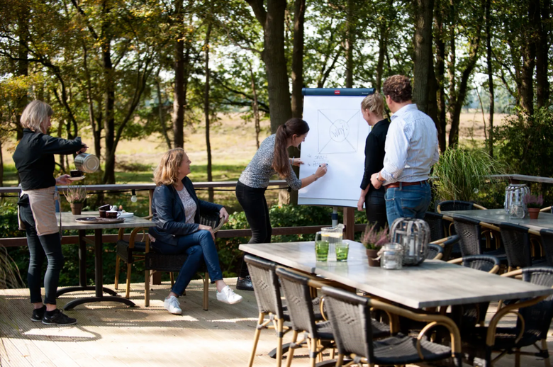 Deze plek is gemaakt voor teams die even echt uit de dagelijkse stand willen. Je werkt hier midden in de natuur, met rust, ruimte en een setting die niet voelt als een standaard vergaderlocatie maar als een frisse reset. Daardoor is het een sterke plek voor een sessie waarbij focus en opladen hand in hand gaan.